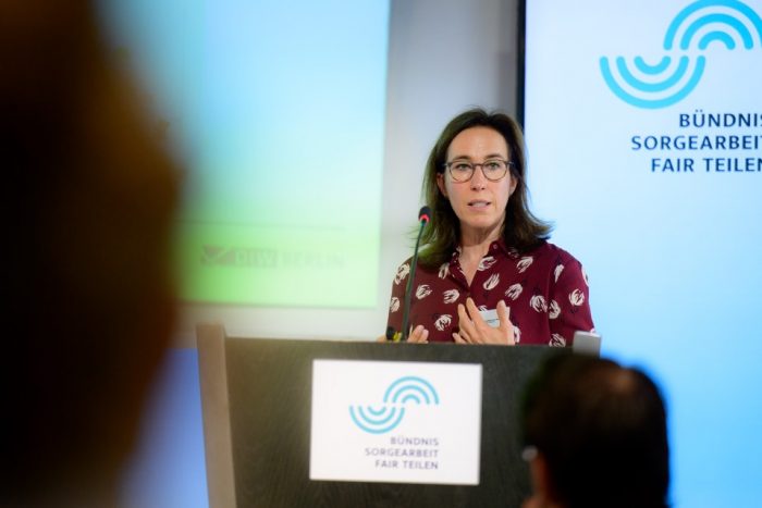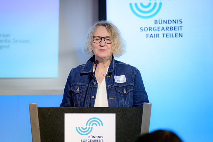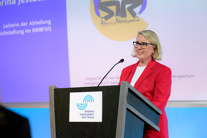 Auch Katharina Jestaedt, Leiterin der Abteilung Gleichstellung im Bundesministerium für Bildung, Familie, Senioren, Frauen und Jugend, hob in ihrem Grußwort hervor, dass eine partnerschaftliche Aufteilung von Care-Aufgaben zentrale Voraussetzung für mehr Erwerbsbeteiligung von Frauen sei – ein erklärtes Ziel der Bundesregierung.