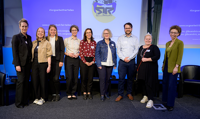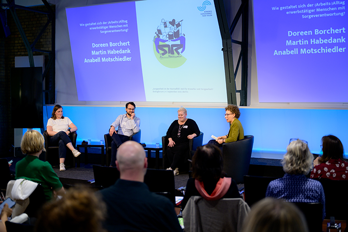 In der abschließenden Podiumsdiskussion mit Vertreter*innen aus der Wirtschaft wie Dr. Astrid Pape von der Bundesvereinigung der Deutschen Arbeitgeberverbände (BDA) und Linda König vom Städtischen Klinikum Dresden, aus der Wissenschaft wie Michaela Hermann von der Bertelsmann Stiftung und Prof. Dr. Katharina Wrohlich vom DIW Berlin sowie aus der Perspektive erwerbstätiger Menschen mit Sorgeverantwortung, vertreten von Martin Habedank, wurde deutlich: Sorgearbeit muss strukturell und kulturell aufgewertet werden, damit sie nicht länger zur „unsichtbaren Last“ vor allem von Frauen – stärker noch von Alleinerziehenden – wird. Aber sich um andere zu kümmern, ist für viele Menschen nicht allein eine Notwendigkeit. Zeit dafür zu haben, ist ihnen auch wichtig. „Sorgearbeit als Normalfall“ hat diese beiden Dimensionen: Beschreibung von Realität bzw. Notwendigkeiten und Hinweis auf individuelle Präferenzen und gesellschaftliche Utopie.